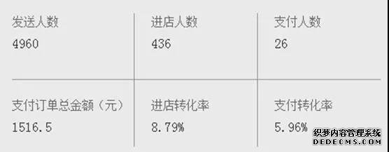 店家發送活動營銷短信給4960位客戶,每條短信成本僅為0.022元,該批次短信帶來的支付訂單總金額為1516.5元,ROI高達13.8。