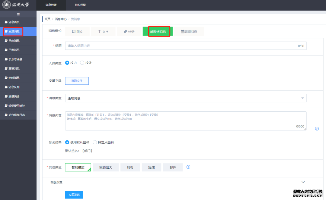 二、點擊左側菜單欄的發送消息,消息模式選擇表格消息。消息標題請自行填寫,僅后臺可見,用于發件人內容管理,接收人的短信內不顯示。