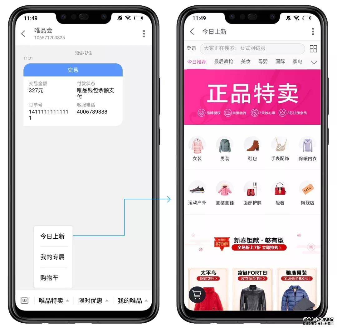 (1)在收到活動消息、或用驗證碼登陸電商平臺時,短信公眾號下方的菜單欄能夠給消費者呈現特賣、促銷、領券等業務場景服務。