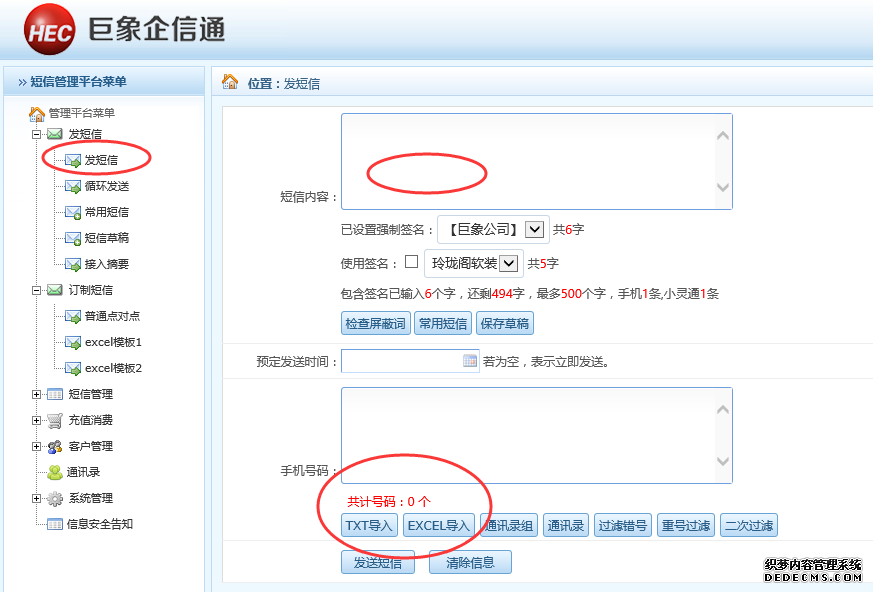 如圖所示填寫下面的短信內容和號碼即可,跟發送普通短信一樣輸入短信內容、導入號碼,導入號碼的方式也一樣。