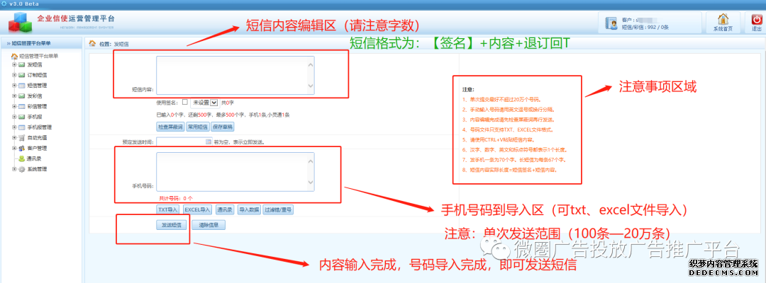 2.支持號碼文件文件一次性導入,支持TXT、EXCEL文件格式。