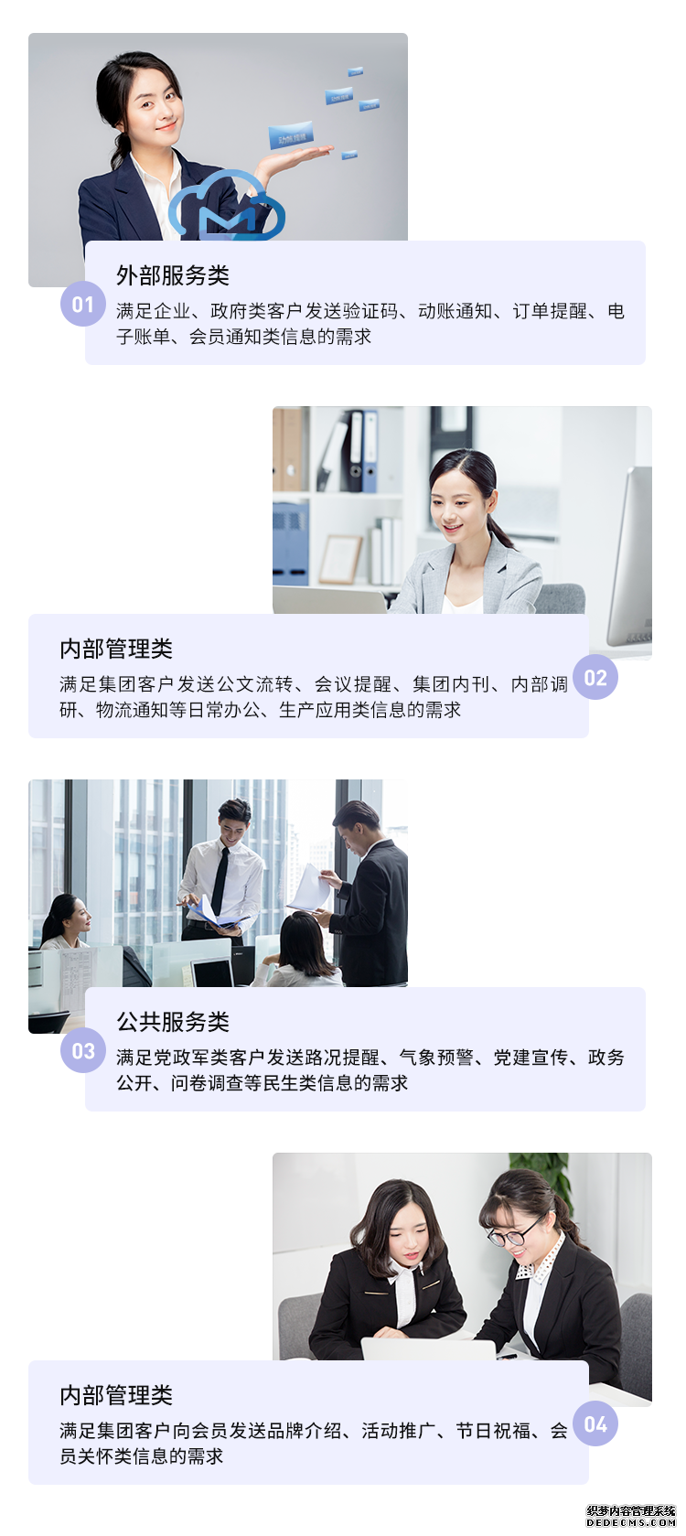 巨象企信通短信群發平臺主要面向互聯網、物流、政務、社衛等行業客戶提供驗證碼下發、密碼下發、支付驗證、物流動態等服務型通知短信,適合沒有內部IT系統,需要快速、簡易的短信發送通道的中小微企業客戶,便于企業快速獲得短消息發送能力。