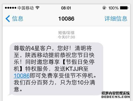 3月30日早上7時16分,還沒有起床的李女士收到陜西移動10086發(fā)來的短信,內(nèi)容為:“尊敬的4星客戶,您好!清明將至,陜西移動提前恭祝您節(jié)日快樂!同時邀請您尊享【節(jié)假日免停機】特權服務,發(fā)送KTJJR至10086即可免費享受佳節(jié)不停機....。.”“竟然收到清明節(jié)祝福的短信,這條短信看得人太郁悶了。”李女士說。